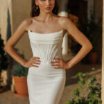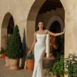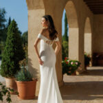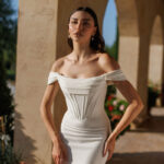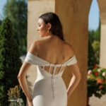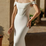 This gown features an exquisite off-shoulder design that gracefully frames the décolletage, complemented by delicate draping that enhances the bust.